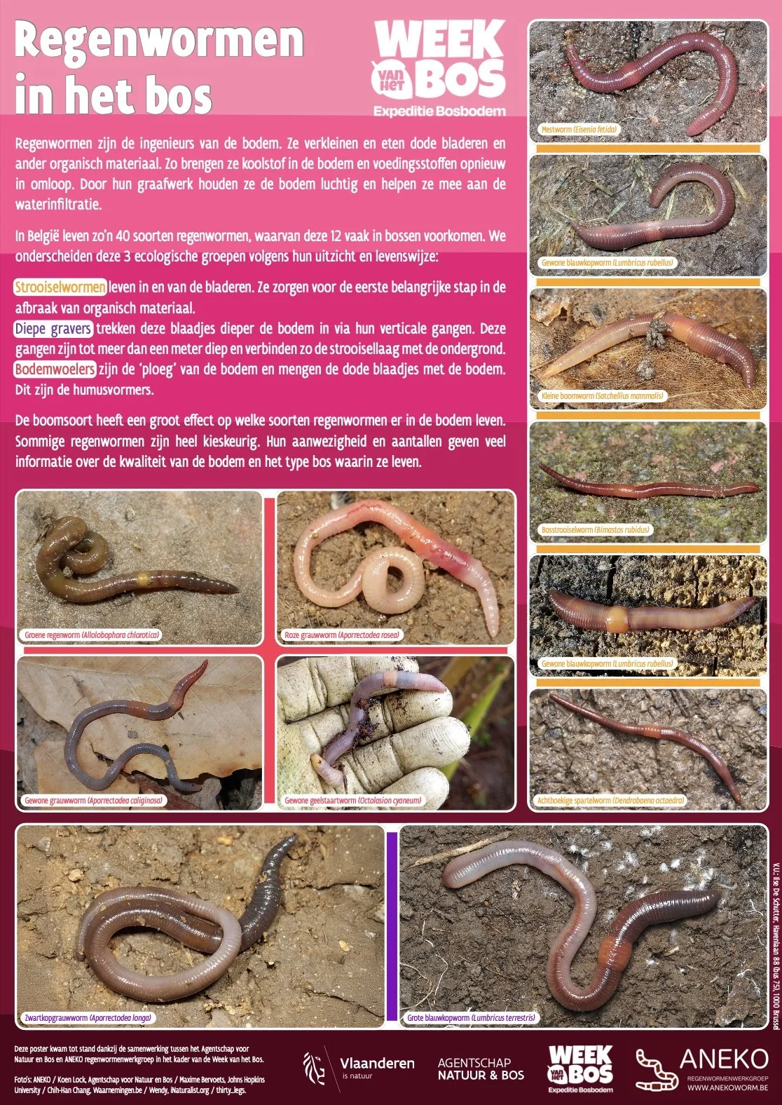 De ANEKO regenwormenwerkgroep ondersteunt de Week van het Bos met haar expertise: poster met 12 soorten regenwormen die je in bossen kan vinden, zoekkaart regenworm ecologische groepen, filmpje met wormenweetjes, regenwormenpaspoort, hoe bouw je een wormenhotel?, op wormenspeurtocht!